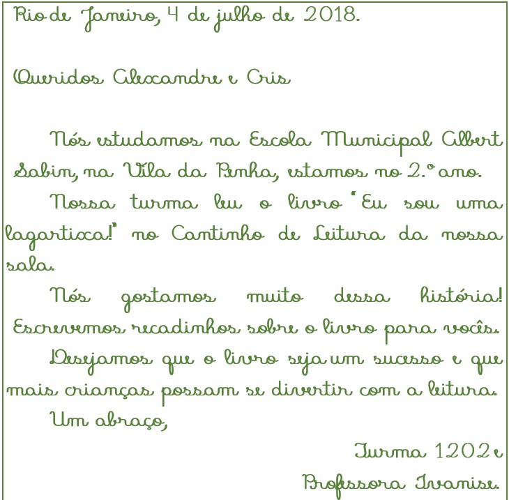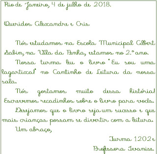 Criamos tantas situações "artificiais" de escrita na escola, e eu tinha ali uma situação real, pois eles escreveram um recado para os autores de um livro que agradou toda turma.