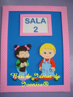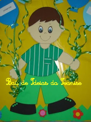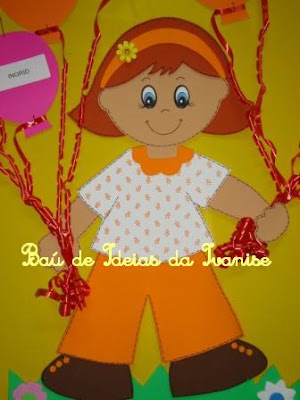 Confeccionei dois bonecos em EVA (recorte e colagem). Recortei os balões em cartolina e colei as etiquetas com os nomes das crianças.